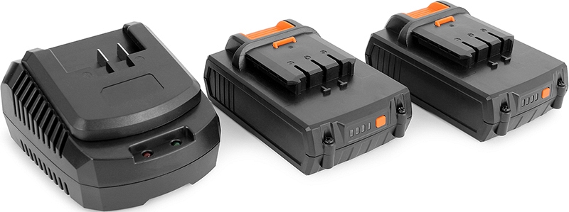 - 2 съемных Li-ion аккумулятора напряжением 18 В, емкостью 2 Ач и зарядное устройство: время зарядки 60 минут