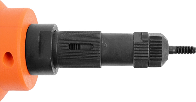 - Комплектуется сменной резьбовой насадкой / оправкой (упорным наконечником и рабочим стержнем) для установки резьбовых заклепок М6