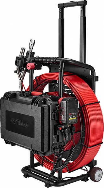 - Головка камеры Ø 29 × 50 мм и проталкиваемый кабель Ø 7,2 мм × 80 м из стекловолокна со счетчиком длины и системой торможения, подходящие для труб Ø 80 – 200 мм, длиной до 80 м
